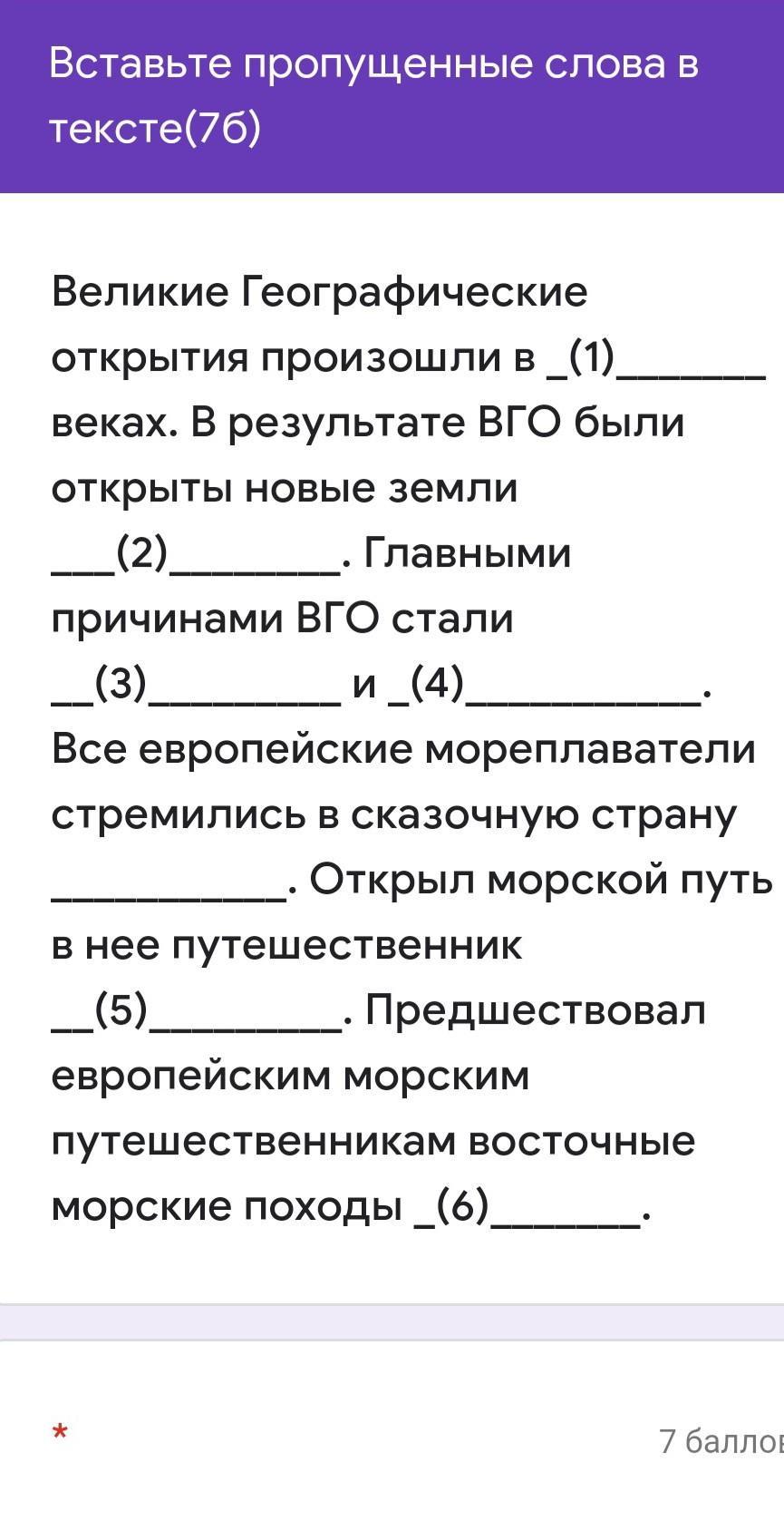 Великие Географические открытия произошли в _(1)_______ веках. В результате ВГО были открыты новые земли ___(2)________. Главными причинами ВГО стали __(3)_________ и _(4)___________. Все европейские мореплаватели стремились в сказочную страну ___________. Открыл морской путь в нее путешественник __(5)_________. Предшествовал европейским морским путешественникам восточные морские походы _(6)9 помогите пж