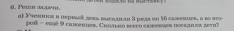 а) Ученики в первый день высадили 3 ряда по 16 саженцев, а во вто-