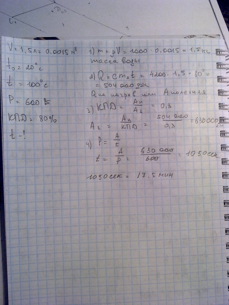 Сколько времени будут нагреваться 1,5 л воды 0т 20 С до 100 С в электрическом чайнике мощностью 600Вт если КПД чайника 80% Ответ 17,5мин помогите решить задачку