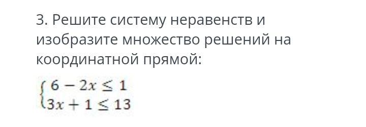 Решите систему неравенств и изобразите множество решений на координатной прямой: 6 — 2х≤1 3x + 1≤13