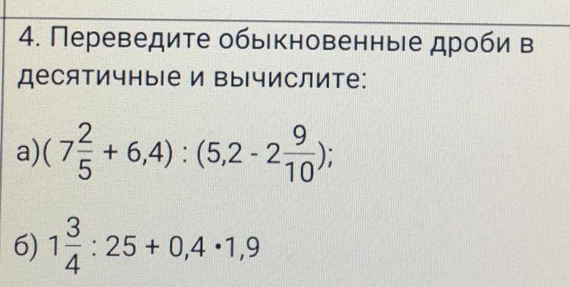 Переведите обыкновенные дроби в десятичные и вычислите: a (7 2/5 + 6, 4) / (5, 2 - 2 9/10) 1 1 3/4 / 25 + 0, 4 * 1, 9