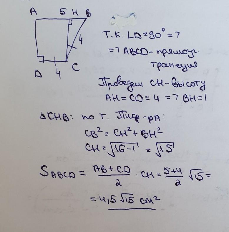 8 класс!! найдите площадь трапеции АВСД, если АВ равен 5 см, ВС равен 4 см, СД равен 4 см, угол Д равен 90°