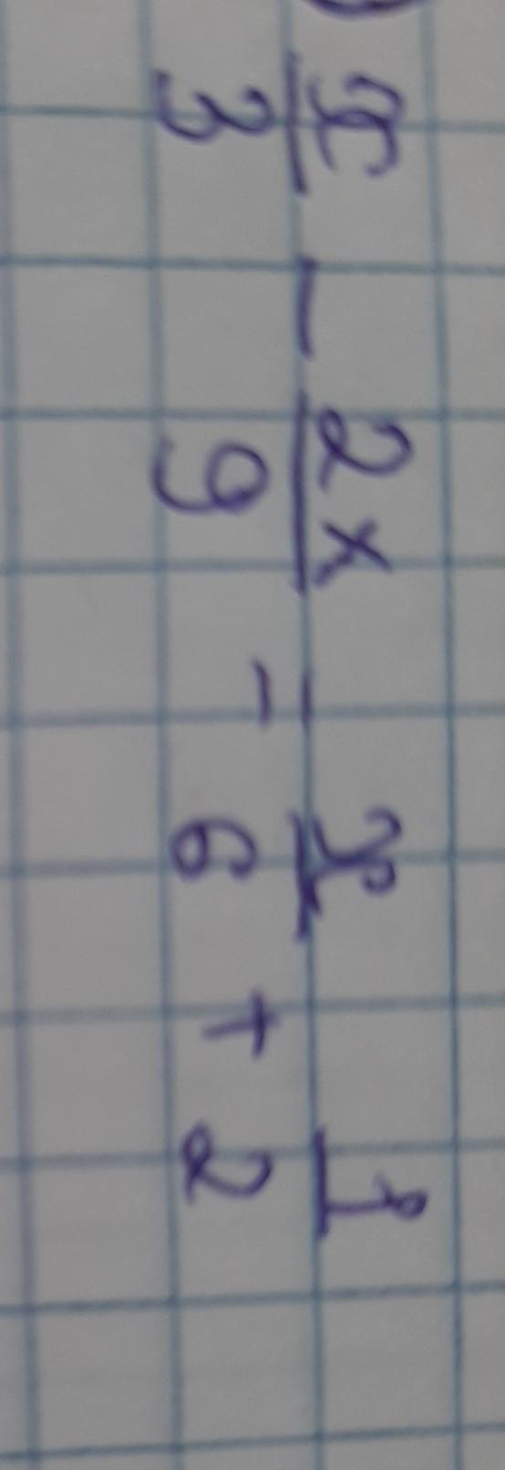 \frac{x}{3}  -  \frac{2x}{9}  =  \frac{x}{6}  +  \frac{1}{2}   \:  \:  \:  \: ( \times 18) \\ 6x - 2 \times 2x = 3x + 9 \times 1  \\ (6 - 4 - 3)x = 9 \\  - x = 9 \\ x =  - 9 \\
