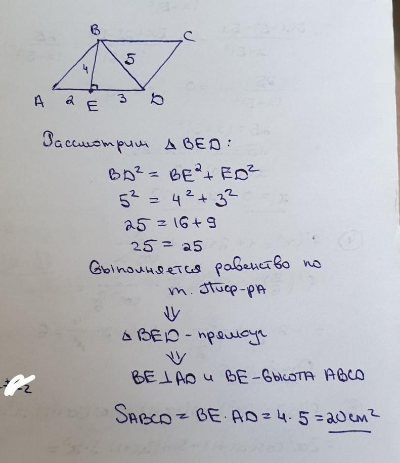 на стороне ад параллелограмма абсд взята точка е так,что ае=2 см,ед=3см,ве=4 см,вд=5 см, найдите площадь параллелограмма