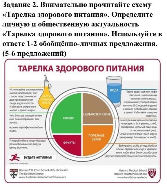 Срочно!!!! Задание 2. Внимательно прочитайте схему «Тарелка здорового питания». Определите личную и общественную актуальность «Тарелка здорового питания». Используйте в ответе 1-2 обобщённо-личных предложения. (5-6 предложений)