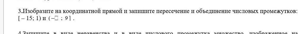 3.Изобразите на координатной прямой и запишите пересечение и объединение числовых промежутков, [-15;1) и (-◻️ ;9]