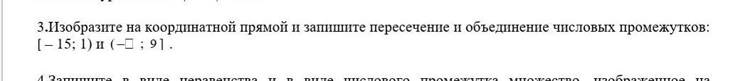 3.Изобразите на координатной прямой и запишите пересечение и объединение числовых промежутков, [-15;1) и (-♾️ ;9]