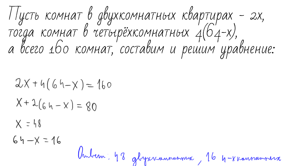 В жилом доме 64 двухкомнатных и четырехкомнатных квартир.Сколько двух комнатных и четырехкомнатных квартир если известно что всего в доме 160 комнат