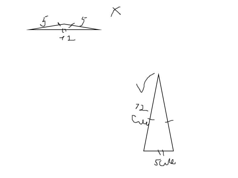 если боковая сторона била б 5 см то 5 + 5 не = 12 ведь если угл между етими сторонами бил б 180 градусов то они были б короче чем основа, по этому