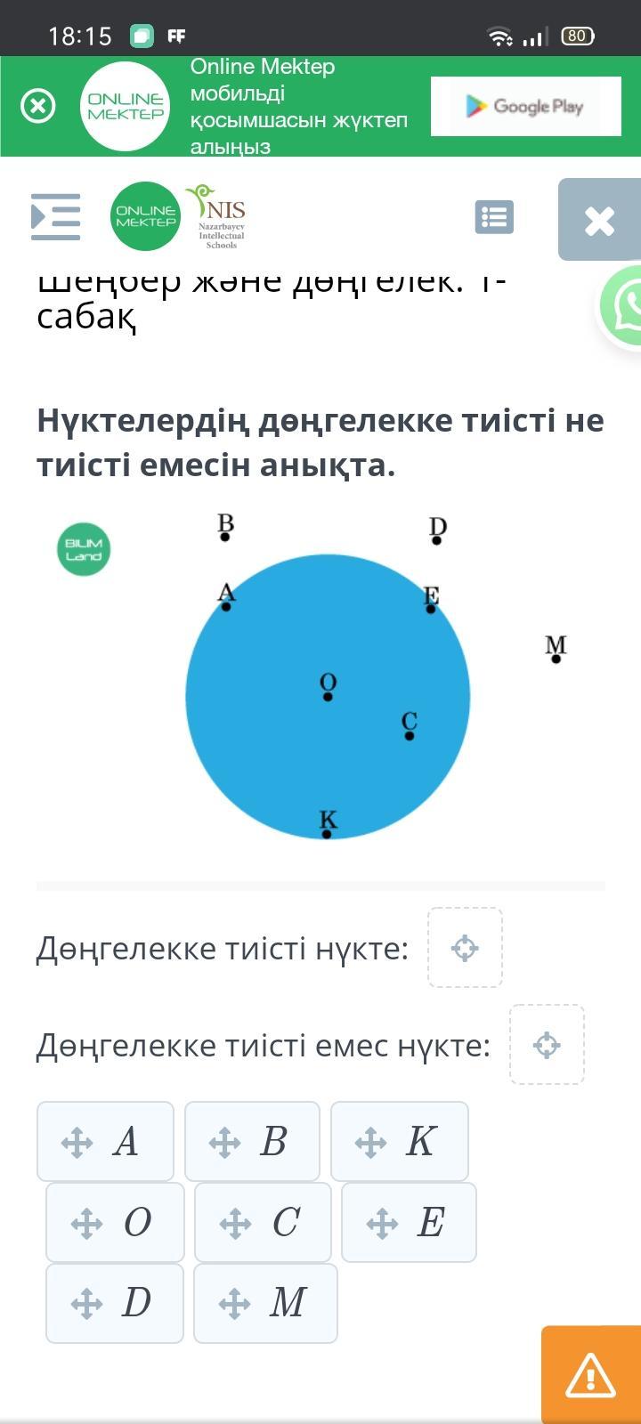 Дөңгелекке тиісті емес нүкте: В, D, M.