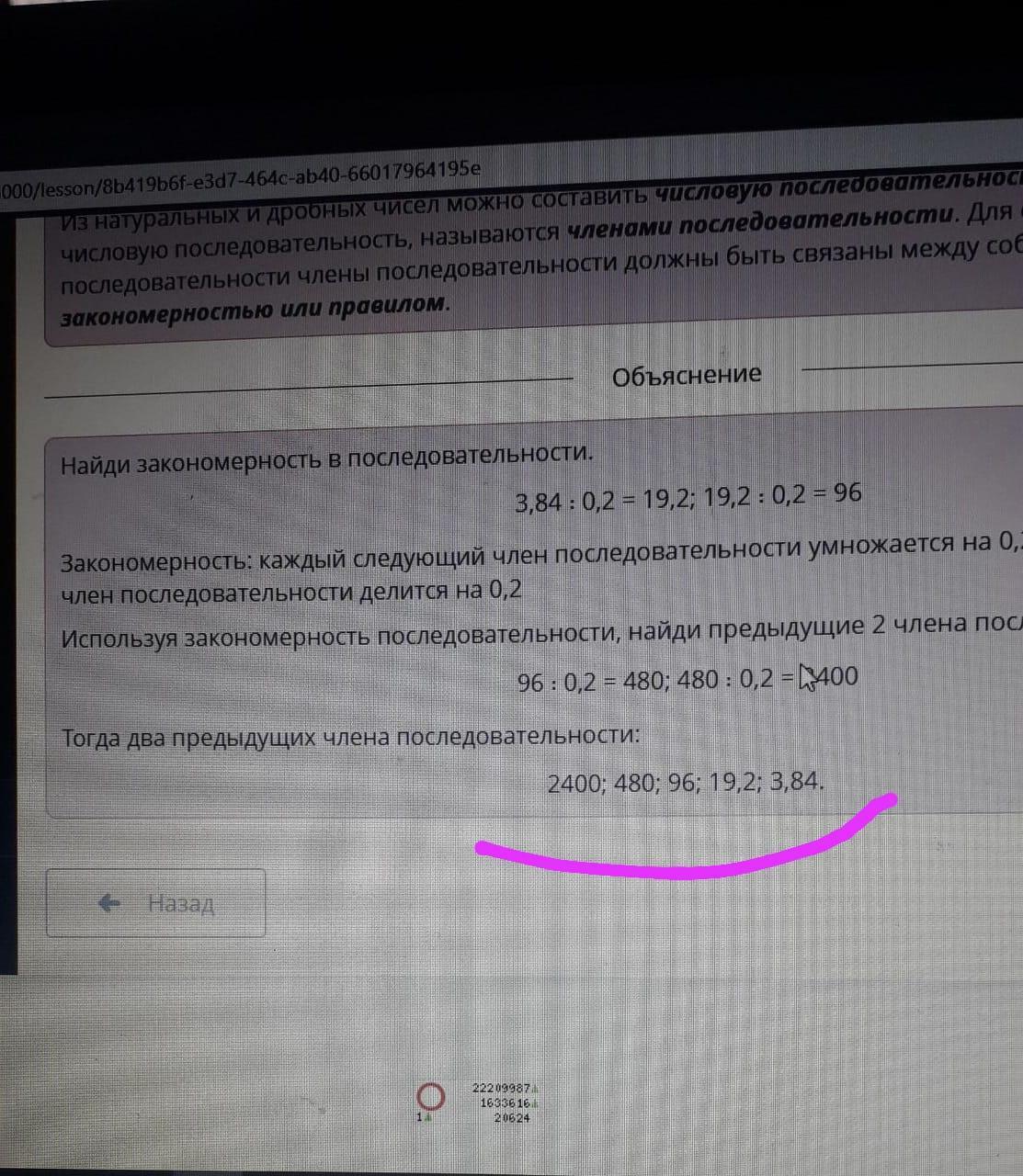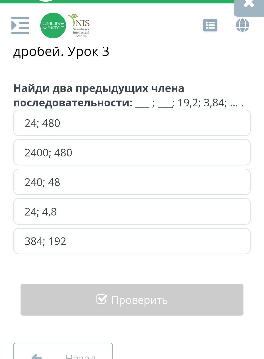 Найди два предыдущих члена последовательности: ___ ; ___; 19,2; 3,84; … .