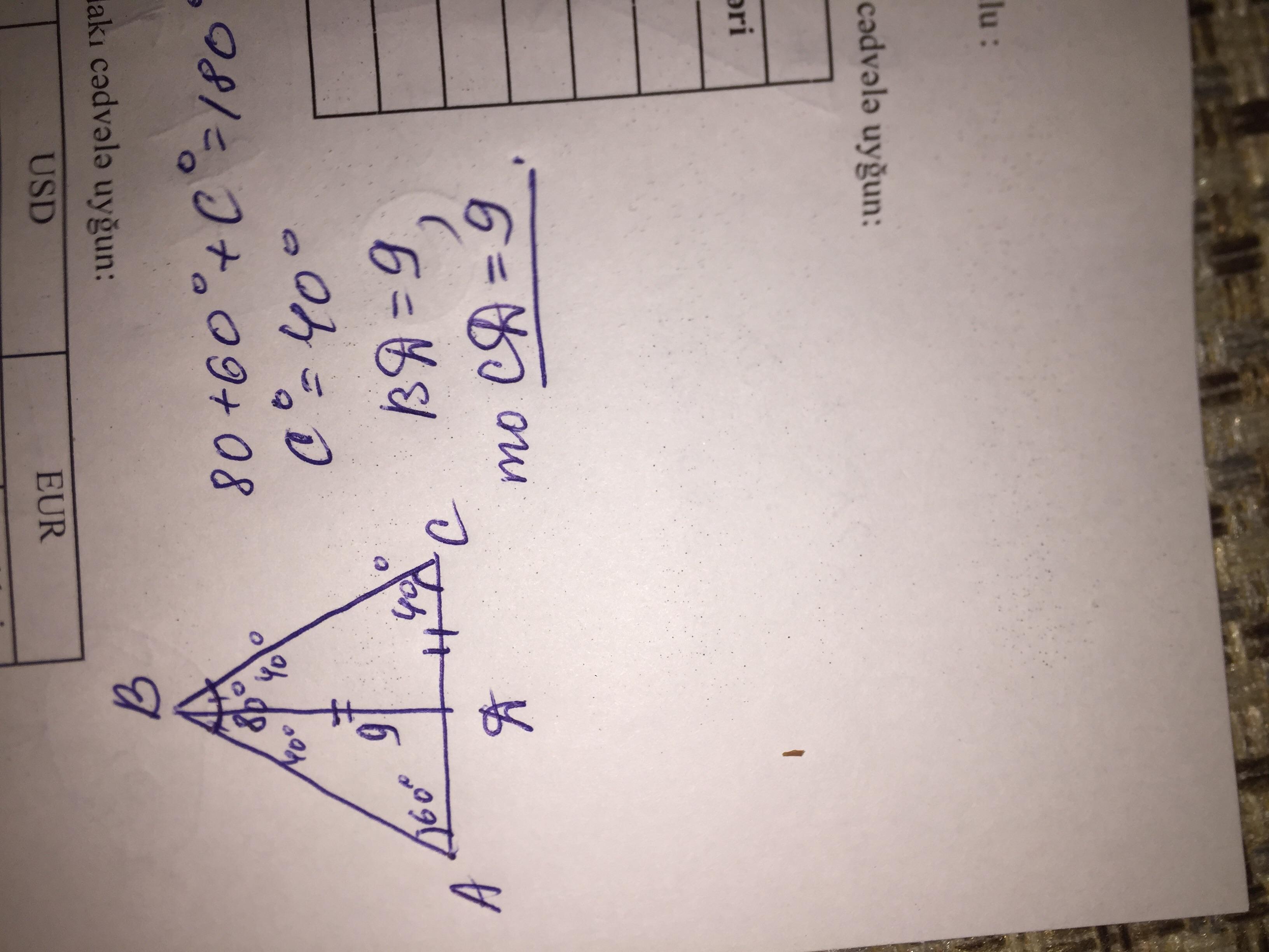 Угол С=40°, половинка угла В=40°. А сторона ВД=9
