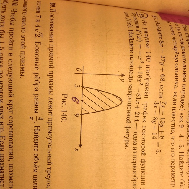 на рисунке изображен график какой функции у=f(x) .функция F(x)=-x3+18x2-81х+214- одна из первообразных функций f(x) . найдите площадь закрашенной фигуры
