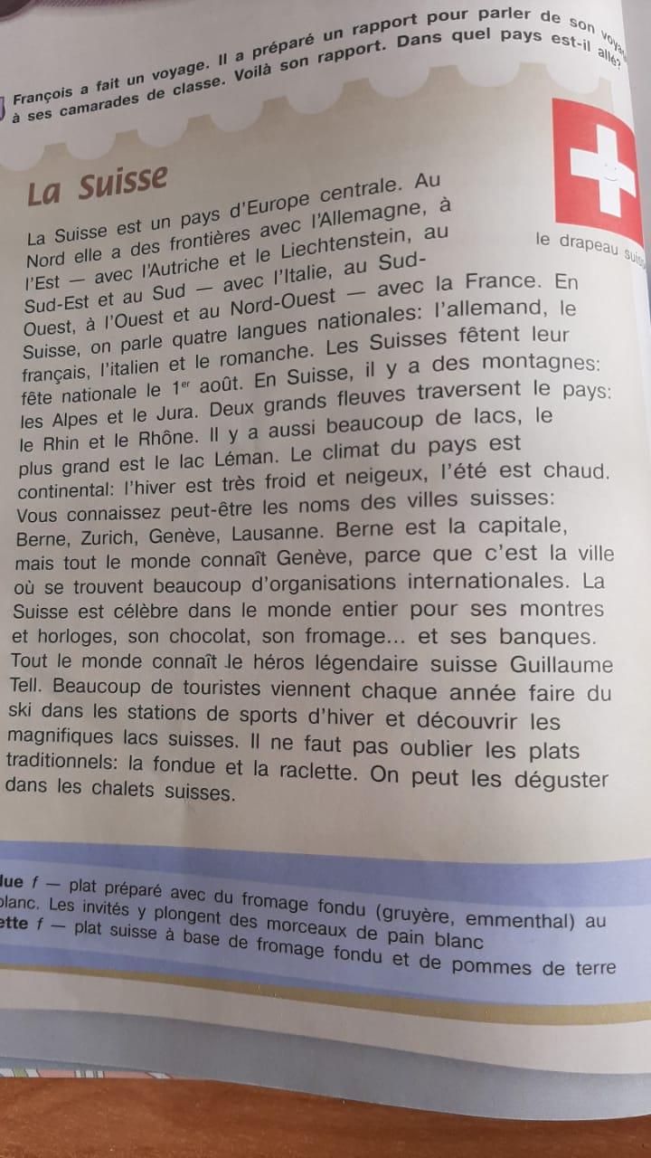Немецком французском итальянском и романшском. Национальный праздник Швейцарии первое августа. Есть горы Альпы и Юра. Две больших реки пересекают страну. Рейн и Рона. Там также много озёр. Самое большое это женевское озеро. Климат в стране континентальный.зимой холодно и снежно. Летом жарко. Возможно вы знаете названия швейцарских городов: Берн Цюрих Женева Лозанна. Берн является столицей.но весь мир знает женеву.потому что это город в котором находятся множество интернациональных организаций. Швейцария известна по всему миру своими часами сыром и шоколадом и банками. Весь мир знает легендарного героя Гийома теля. Много туристов приезжают каждый год покататься на лыжах на зимних спортивных станциях. И открыть для себя прекрасные озера. Не забывайте так же о традиционных блюдах фондю и раклет. Вы можете попробовать их в швейцарских шале.