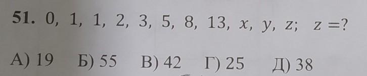 кароч смотри нам в начале дали 0 и 1 и каждое последующее число это сумма двух предыдущих чисел вот: 0+1=1,1+1=2,1+2=3,2+3=5,3+5=8,5+8=13,8+13=21,13+21=34,21+34=55.