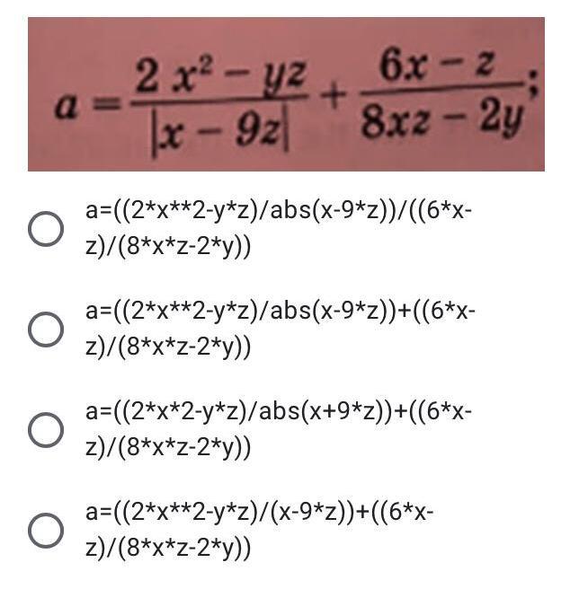 a=((2*x**2-y*z)/abs(x-9*z))+((6*x-z)/(8*x*z-2*y))