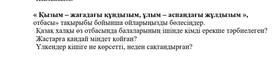 « Қызым - жағадағы құндызым, ұлым - аспандағы жұлдызым отбасы» тақырыбы бойынша ойларыңызды бөлесіңдер. Қазақ халқы өз отбасында балаларының ішінде кімді ерекше тәрбиелеген? Жастарға қандай міндет қойған? Үлкендер кішіге не көрсетті, неден сақтандырған?.