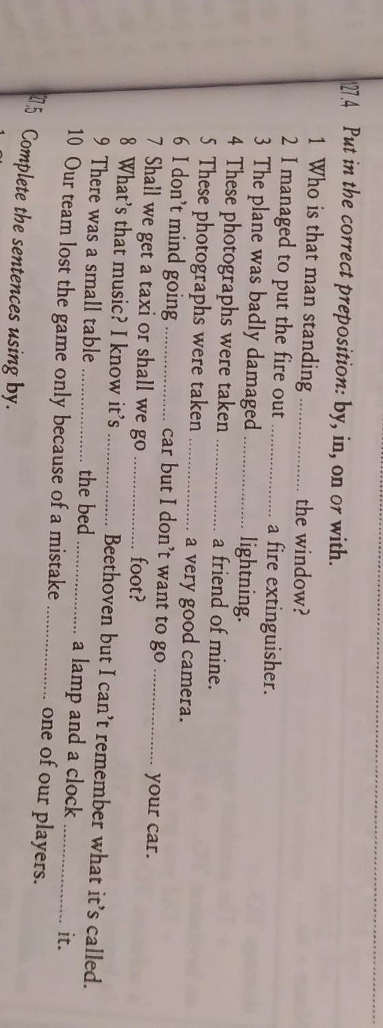 127.4 Put in the correct preposition : by ,in,on, or with.