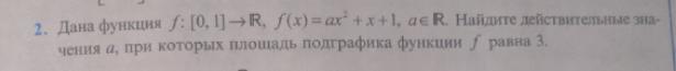 Площадь подграфика равна определенному интегралу на заданном участке. Поэтому нужно просто проинтегрировать уравнение ax^2 + x + 1 на участке от 0 до 1 и посмотреть, что получается.