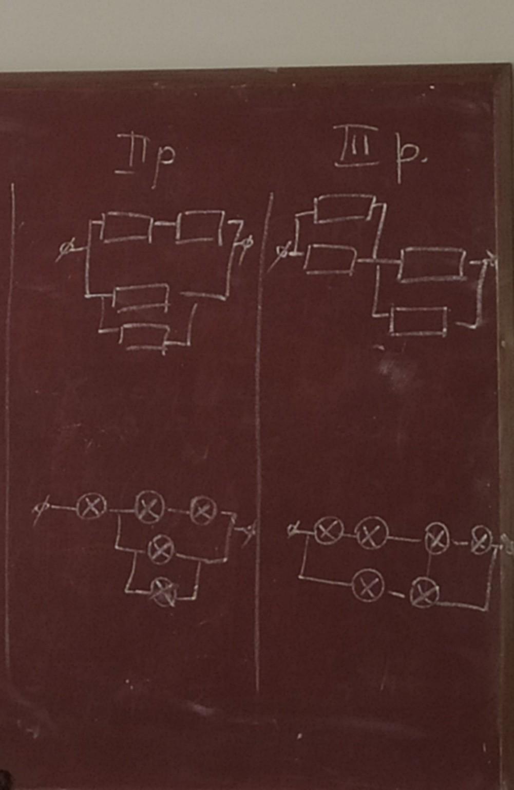 Первая схема слева: вверхудва резистора последовательно, имеем R1+R2=2+2=4Om, два снизу включены паралельно ,можно считать как R1*R2/R1+R2=4/4=1 Om, в результате получили паралельное соединение двух резисторов 4 Ом и 1 Ом, где общее сопротивление составит меньше 1 Ома: 4*1/4+1=0.8Ом,,