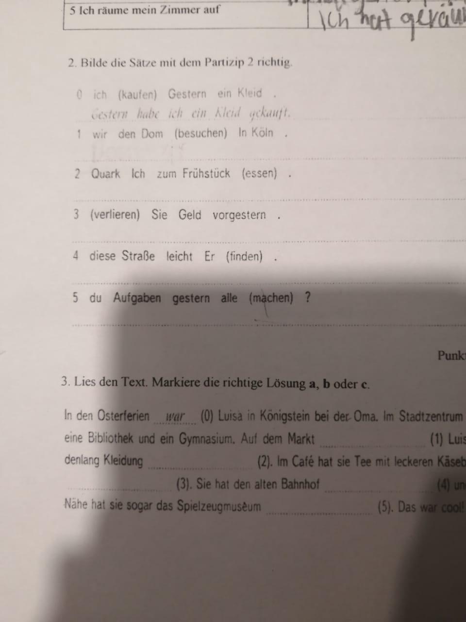 Im Stadtzentrum gibt es eine Bibliothek und ein Gymnasium. Auf dem Markt hat (1) Luisa stundenlang Kleidung gekauft (2). Im Café hat sie Tee mit leckeren Käsebrötchen gegessen (3). Sie hat den alten Bahnhof gesehen (4) und in der Nähe hat sie sogar das Spielzeugmuseum gefunden (5) Das war cool!