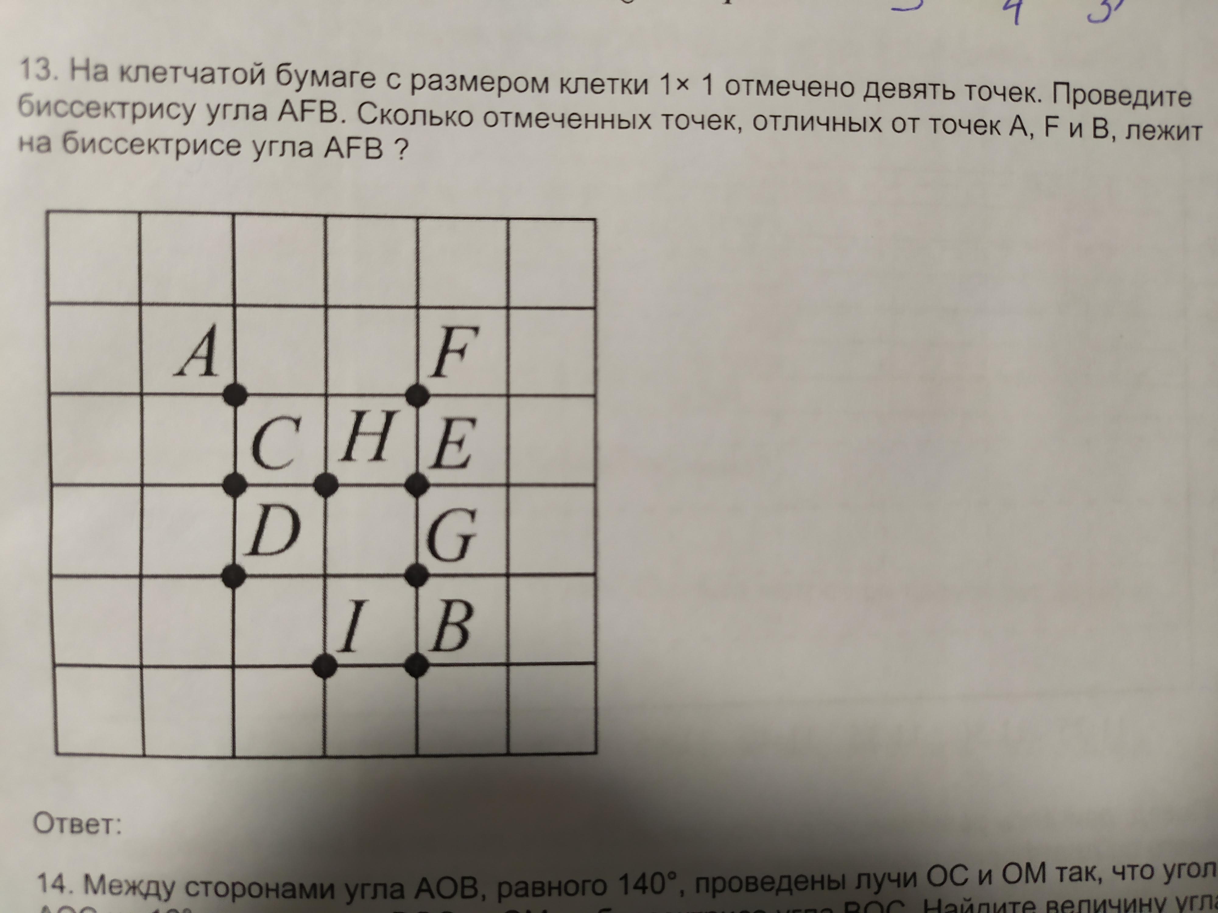 угол АFB равен 90 градусам,его биссектриса поделит его на 2 угла по 45 градусов и пройдет через токи C и H
