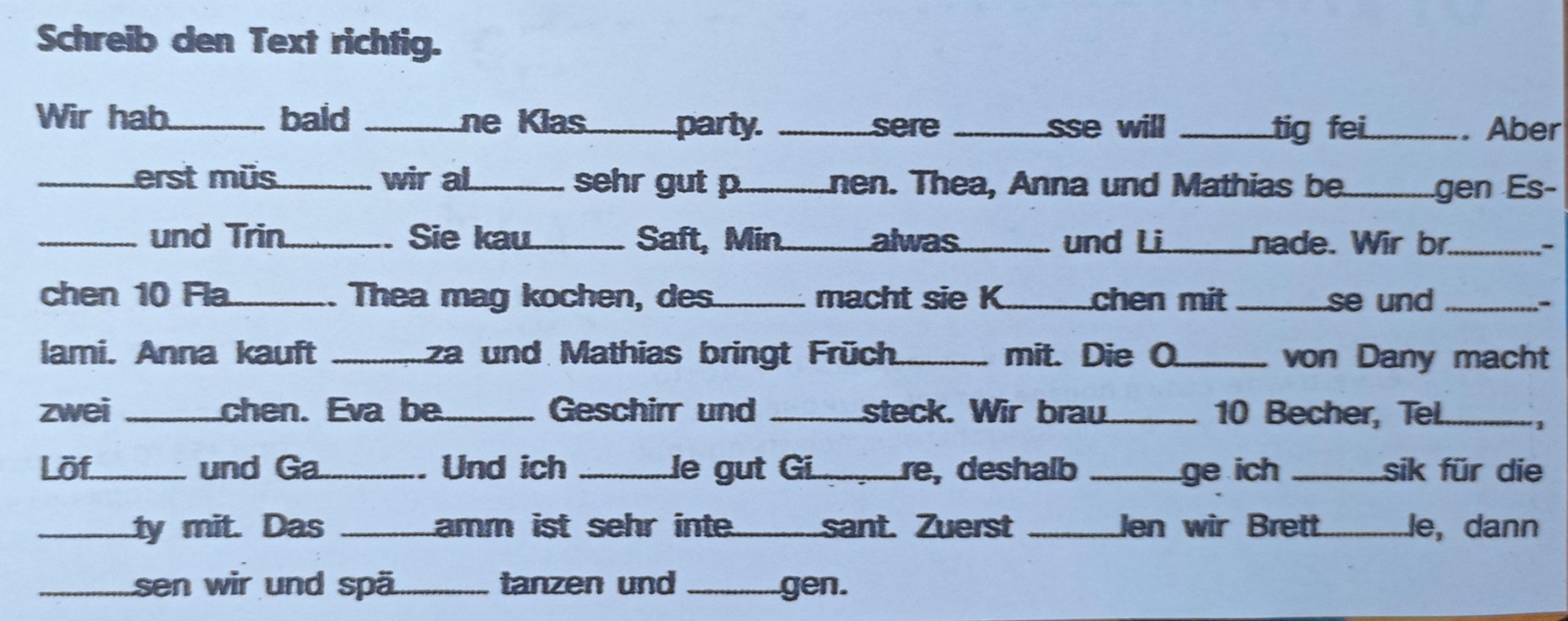 Wir haben bald eine Klassenparty. Unsere Klasse will heftig feiern. Aber zuerst müssen wir alle sehr gut planen. Thea, Anna und Mathias besorgen Essen und Trinken. Sie kaufen Saft, Mineralwasser und Limonade. Wir brauchen 10 Flaschen. Thea mag kochen, deshalb macht sie Kartoffelkuchen mit Käse und Salami. Anna kauft Pizza und Mathias bringt Früchte mit. Die Oma von Dany macht zwei Kuchen. Eva besorgt Geschirr und Besteck. Wir brauchen 10 Becher, Teller, Löffel und Gabeln. Und ich spiele gut Gitarre, deshalb bringe ich Musik für die Party mit. Das Programm ist sehr interessant. Zuerst spielen wir Brettspiele, dann essen wir und später tanzen und singen.