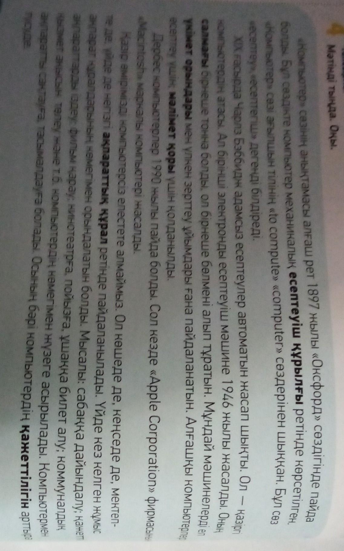 Есептеуіш құрылы-вычислительное устройство, салмағы-масса, үкімет орындары- правительское учереждение, мәлімет қоры- база данных, ақпараттық құрал-газетная информация, қажеттілігін- необходимость