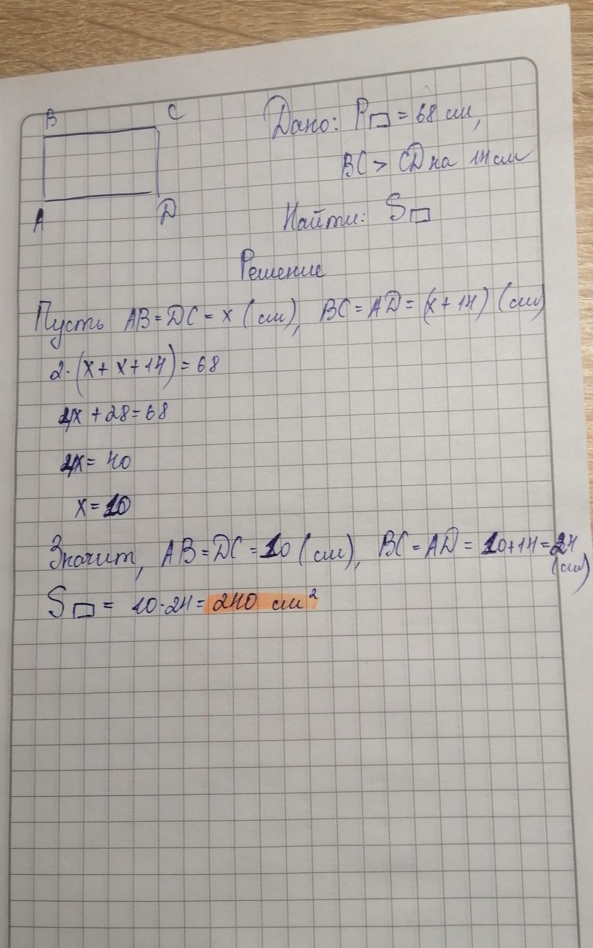 Найдите площадь прямоугольника с периметром 68 см и разницей в 14 см между сторонами прямоугольника