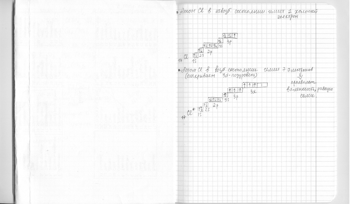 Сколько неспаренных электронов имеет атом хлора в нормальном и возбуждённом состояниях? Распределите эти электроны по квантовым ячейкам. Чему равна валентность хлора, обусловленная неспаренными электронами?