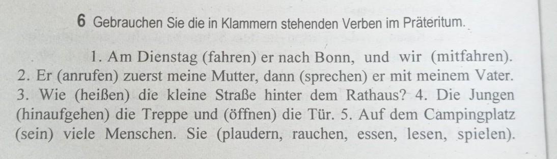 1. Am Dienstag fuhr er nach Bonn, und wir mitfuhren. 2. Er rief zuerst meine Mütter an, dann sprach er mit meinem Vater. 3. Wie hießen die kleine Straße hinter dem Rathaus? 4. Die Kinder gingen die Treppe hinauf und öffneten die Tür. 5. Auf dem Campingplatz waren viele Menschen. Sie plauderten, rauchten, aßen, lasen, spielten.