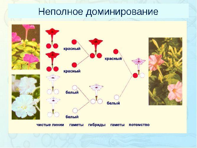 Неполное доминирование - когда доминантный признак проявляется только при наличии двух доминантных аллельных генов в генотипе. В том случае если организм гетерозиготен, т. е. имеет лишь один доминантный аллель, в фенотипе проявляется промежуточный признак. Например, при скрещивании белого цветка с красным в следующем поколении появляются цветы розового цвета.