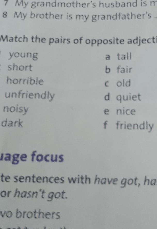 1 young - c 2 short a 3 horrible nice 4 unfriendly-f 5 noisy quiet 6 dark - b