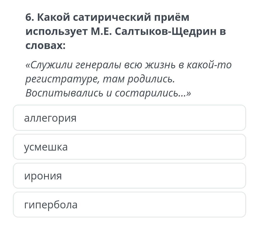 Какой сатирический прием использует н.е. салтыков-щедрин в словах: «служили генералы всю жизнь в какой-то регистратуре, там родились. воспитывались и состарились…»