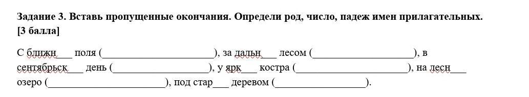 Ответ:с ближнего поля(женский род,ед.ч,Род.П),за дальним лесом(м.р,ед.ч,творительный падеж),в сентябрьский день(м.р,ед.ч,И.п),у яркого костра(м.р,ед.ч,Р.п),на лесное озеро(ср.р,ед.ч,В.п),под старинным деревом(ср.р,ед.ч,Т.п)