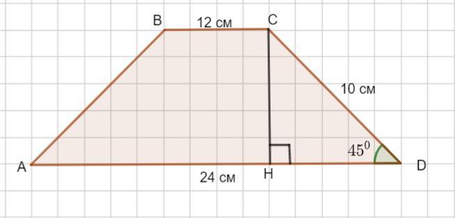 AD= 24 см , боковая сторона CD= 10 см , ∠D= 45°.