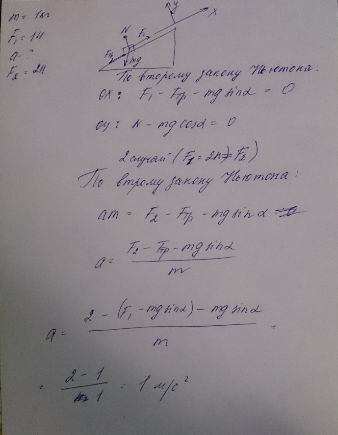 Тело массой 1 кг движется равномерно вверх по наклонной плоскости под действиемсилы тяги, направленной параллельно наклонной плоскости и равной 1Н. С каким ускорением будет двигаться тело, если величина силы тяги возрастёт вдвое?