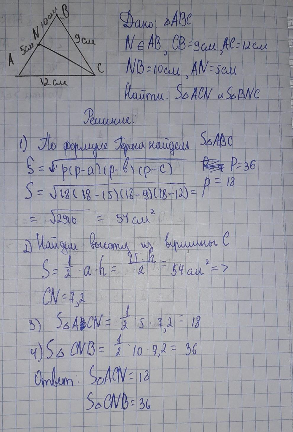Дан треугольник АВС. На стороне АВ отмечена точка N так, что AN =5см, NB =10см Найдите площадь треугольников ACN и BCN, если AC=12см, BC= 9см