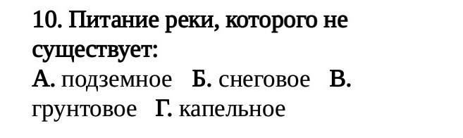А. подземное Б. снеговое В. грунтовое Г. капельное