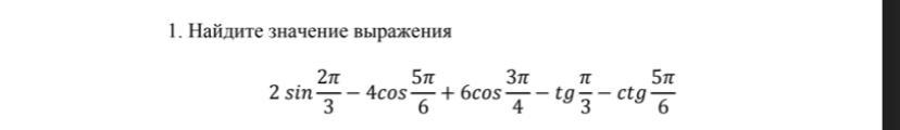 2 \sin( \frac{2\pi}{3} )  - 4 \cos( \frac{5\pi}{6} )  + 6 \ \cos( \frac{3\pi}{4} )   - ctg( \frac{5\pi}{6} ) =  \\  = 2 \times  \frac{ \sqrt{3} }{2}  - 4  \times ( -  \frac{ \sqrt{3} }{2} ) + 6 \times ( -  \frac{ \sqrt{2} }{2} ) - ( -  \sqrt{3} ) =  \\  =  \sqrt{3}  + 2 \sqrt{3}  - 3 \sqrt{2}  +  \sqrt{3} =   4\sqrt{3}   - 3 \sqrt{2}