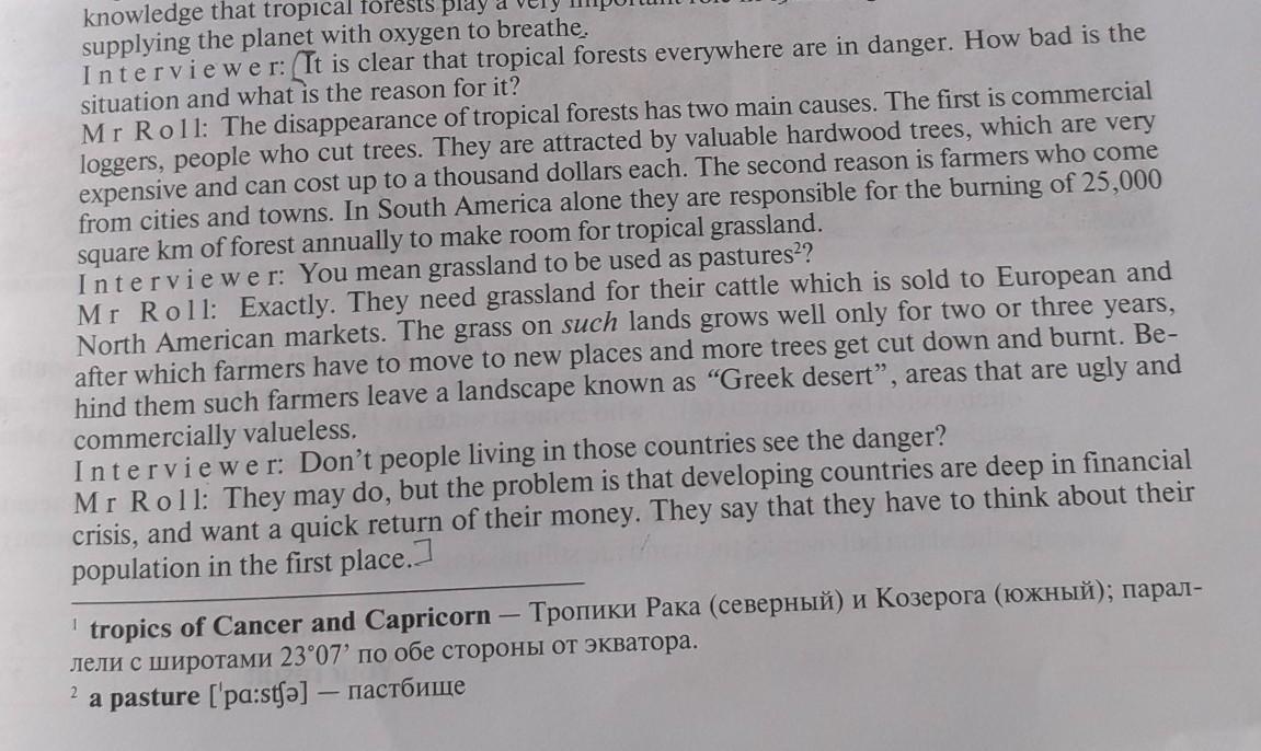 Мистер Ролл: Исчезновение тропических лесов вызвано двумя основными причинами. Первый - это коммерческие лесорубы, люди, которые рубят деревья. Их привлекают ценные деревья лиственных пород, которые очень дороги и могут стоить до тысячи долларов каждое. Вторая причина - это фермеры из больших и малых городов. Только в Южной Америке они несут ответственность за выжигание 25000 квадратных километров леса ежегодно, чтобы освободить место для тропических лугов.