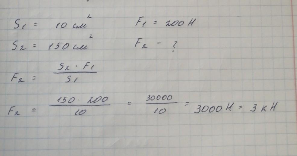 Площадь меньшего поршня гидровлического пресса 10см² на него действует сила 200H Площадь большего поршня 150см².Какая сила действует поршень
