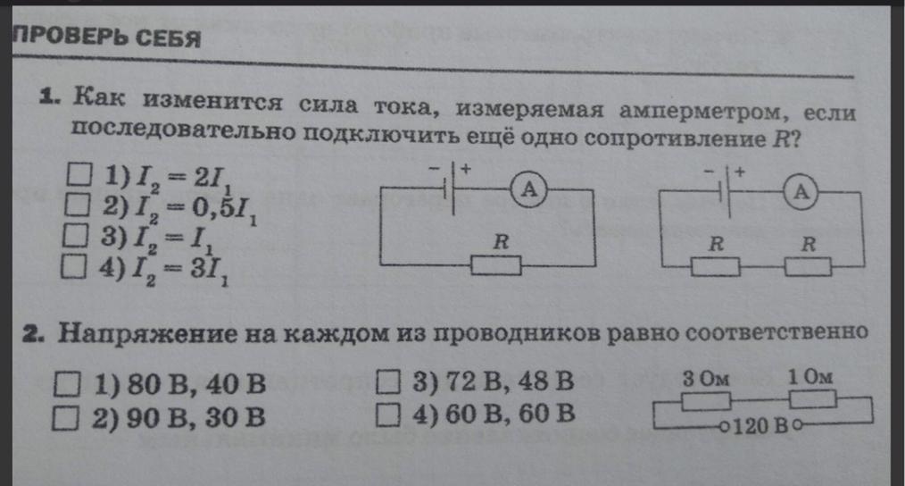 1. Как изменится сила тока, измеряемая амперметром, если последовательно подключить ещё одно сопротивление R?