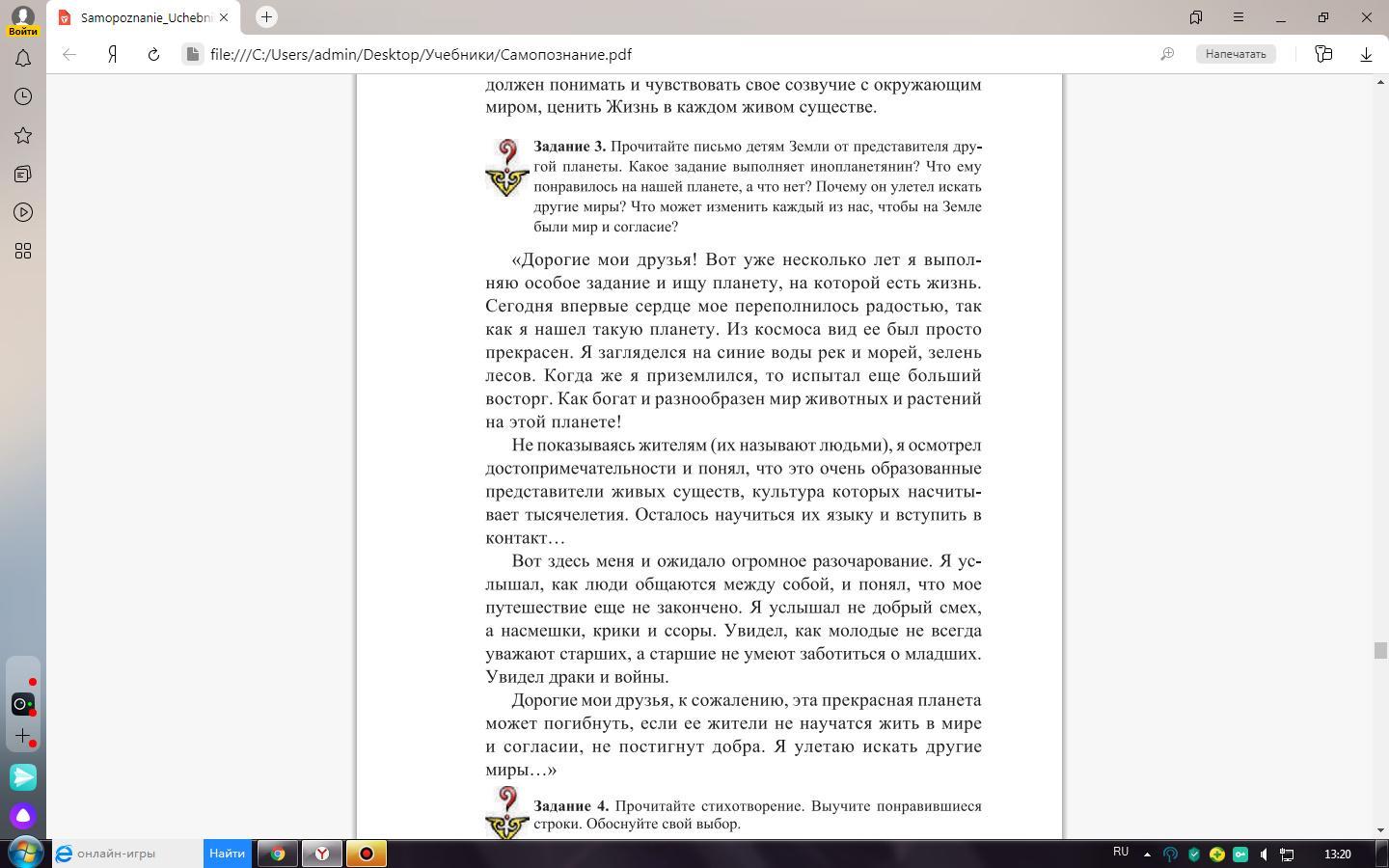 Прочитайте письмо детям Земли от представителя другой планеты. Какое задание выполняет инопланетянин? Что ему понравилось на нашей планете, а что нет? Почему он улетел искать другие миры? Что может изменить каждый из нас, чтобы на Земле были мир и согласие?