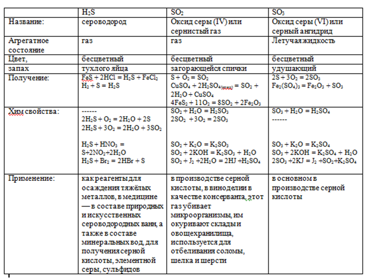 сравнения свойств в виде таблицы