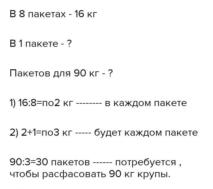 17. Расфасовали 16 кг крупы поровну в 8 пакетов.
