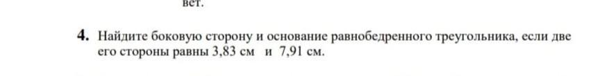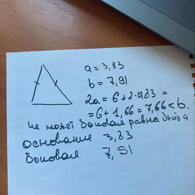 2) Решение примем за боковую сторону 7,91; 7,91+7,91>3,83 неравенство сходится Основание 3,83; боковая сторона 7,91