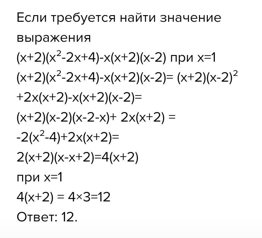 Б) покажите, что значение выражения (х+2)(х^2 - 2х+4)-х(х+2)(х-2) при х=1 равно 12