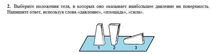 Ответ: Наибольшее давление тело будет оказывать в положении под номером "2", т.к. давление - это физическая величина, равная отношению силы, действующей перпендикулярно поверхности, к площади этой поверхности. Сила во всех 3 случаях будет равна, но в каждом варианте отличается площадь поверхности. Очевидно, что в 3-ем варианте она самая большая, в 1-ом поменьше, а во 2-ом самая маленькая. Чем меньше площадь опоры, тем больше давление, производимой одной и той же силой на эту опору, значит самое большое давление будет оказывать тело на рисунке "2".