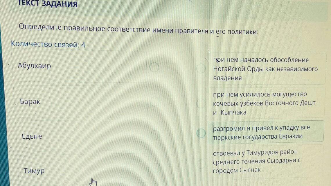 Абулхаир-при нем усилилось могущество и тд. Барак-отвоевал у Тимуридов район и тд. Едыге-при нем началось обособление и тд. Тимур-разгромил и привел к упадку и тд.